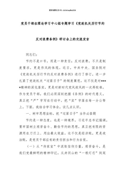 【七哥公文】2025年:【七哥公文】党员干部在理论学习中心组专题学习《党政机关厉行节约反对浪费条例》研讨会上的交流发言+更多免费公文+VX:QiGeGongWen2024+更多免费公文+VX:QiGeGongWen2024