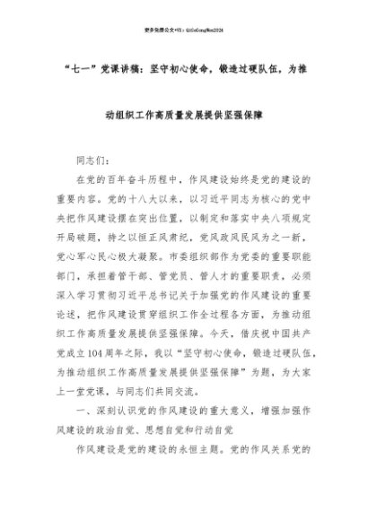【七哥公文】2025年:【七哥公文】“七一”党课讲稿:坚守初心使命,锻造过硬队伍,为推动组织工作高质量发展提供坚强保障+更多免费公文+VX:QiGeGongWen2024+更多免费公文+VX:QiGeGongWen2024