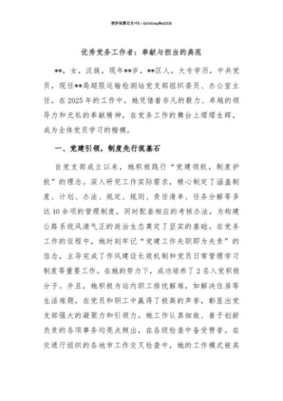 【七哥公文】2025年:【七哥公文】优秀党务工作者:奉献与担当的典范+更多免费公文+VX:QiGeGongWen2024+更多免费公文+VX:QiGeGongWen2024