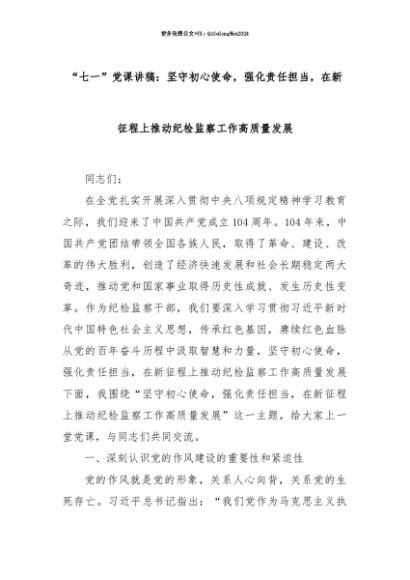 【七哥公文】2025年:【七哥公文】“七一”党课讲稿:坚守初心使命,强化责任担当,在新征程上推动纪检监察工作高质量发展+更多免费公文+VX:QiGeGongWen2024+更多免费公文+VX:QiGeGongWen2024