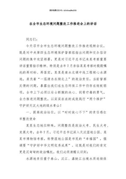 【七哥公文】2025年:【七哥公文】在全市生态环境问题整改工作推进会上的讲话+更多免费公文+VX:QiGeGongWen2024+更多免费公文+VX:QiGeGongWen2024