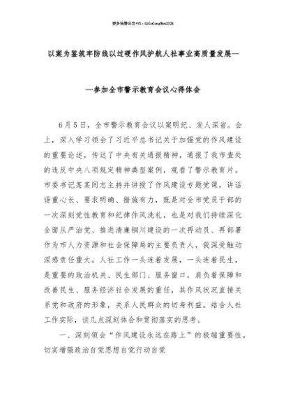 【七哥公文】2025年:【七哥公文】以案为鉴筑牢防线以过硬作风护航人社事业高质量发展——参加全市警示教育会议心得体会+更多免费公文+VX:QiGeGongWen2024+更多免费公文+VX:QiGeGongWen2024