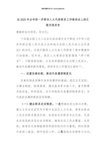 【七哥公文】2025年:【七哥公文】在2025年全市进一步密切人大代表联系工作推进会上的汇报交流发言+更多免费公文+VX:QiGeGongWen2024+更多免费公文+VX:QiGeGongWen2024