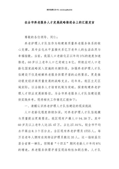 【七哥公文】2025年:【七哥公文】在全市养老服务人才发展战略推进会上的汇报发言+更多免费公文+VX:QiGeGongWen2024+更多免费公文+VX:QiGeGongWen2024
