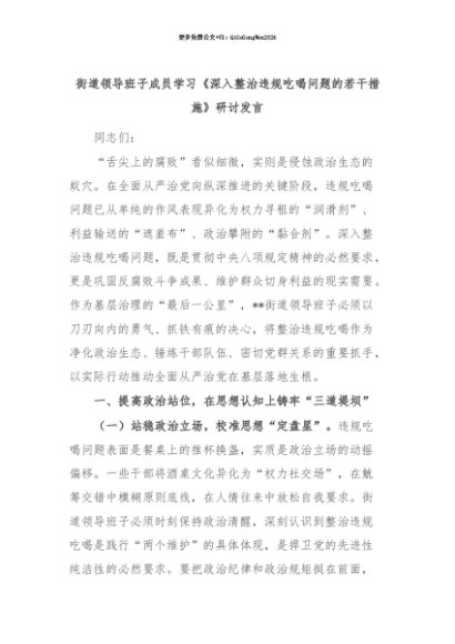 【七哥公文】2025年:【七哥公文】街道领导班子成员学习《深入整治违规吃喝问题的若干措施》研讨发言+更多免费公文+VX:QiGeGongWen2024+更多免费公文+VX:QiGeGongWen2024
