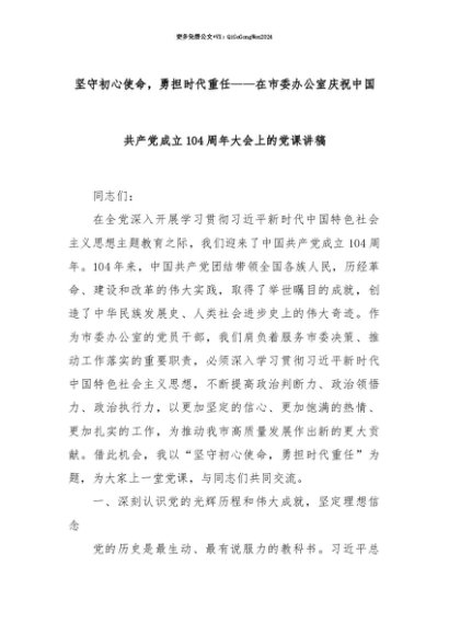 【七哥公文】2025年:【七哥公文】坚守初心使命,勇担时代重任——在市委办公室庆祝中国共产党成立104周年大会上的党课讲稿+更多免费公文+VX:QiGeGongWen2024+更多免费公文+VX:QiGeGongWen2024
