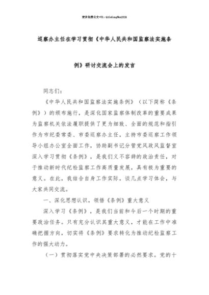 【七哥公文】2025年:【七哥公文】巡察办主任在学习贯彻《中华人民共和国监察法实施条例》研讨交流会上的发言+更多免费公文+VX:QiGeGongWen2024+更多免费公文+VX:QiGeGongWen2024