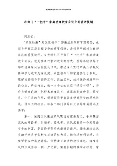 【七哥公文】2025年:【七哥公文】在部门“一把手”家庭助廉教育会议上的讲话提纲+更多免费公文+VX:QiGeGongWen2024+更多免费公文+VX:QiGeGongWen2024