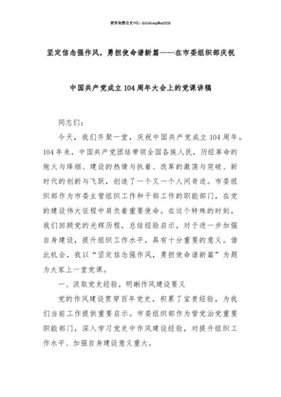 【七哥公文】2025年:【七哥公文】坚定信念强作风,勇担使命谱新篇——在市委组织部庆祝中国共产党成立104周年大会上的党课讲稿+更多免费公文+VX:QiGeGongWen2024+更多免费公文+VX:QiGeGongWen2024