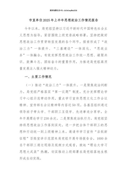 【七哥公文】2025年:【七哥公文】市直单位2025年上半年思想政治工作情况报告+更多免费公文+VX:QiGeGongWen2024+更多免费公文+VX:QiGeGongWen2024