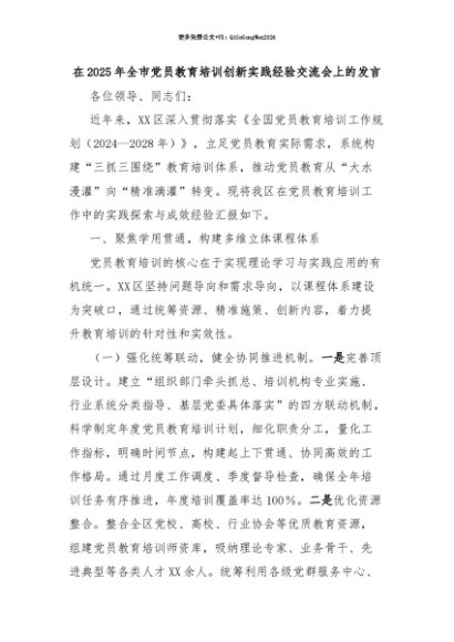【七哥公文】2025年:【七哥公文】在2025年全市党员教育培训创新实践经验交流会上的发言+更多免费公文+VX:QiGeGongWen2024+更多免费公文+VX:QiGeGongWen2024