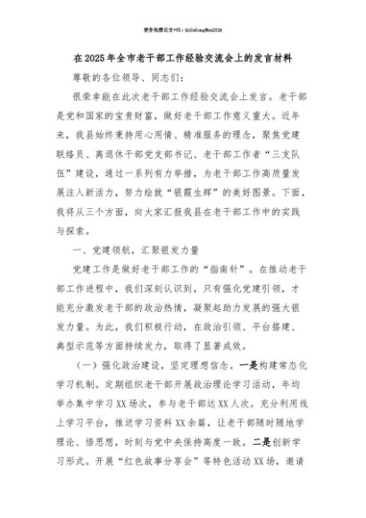 【七哥公文】2025年:【七哥公文】在2025年全市老干部工作经验交流会上的发言材料+更多免费公文+VX:QiGeGongWen2024+更多免费公文+VX:QiGeGongWen2024