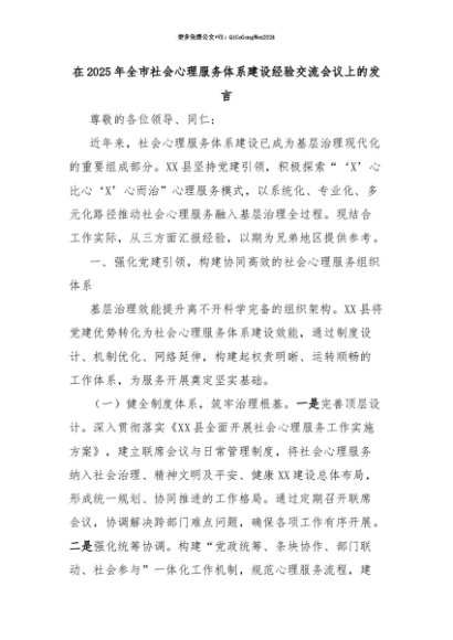 【七哥公文】2025年:【七哥公文】在2025年全市社会心理服务体系建设经验交流会议上的发言+更多免费公文+VX:QiGeGongWen2024+更多免费公文+VX:QiGeGongWen2024
