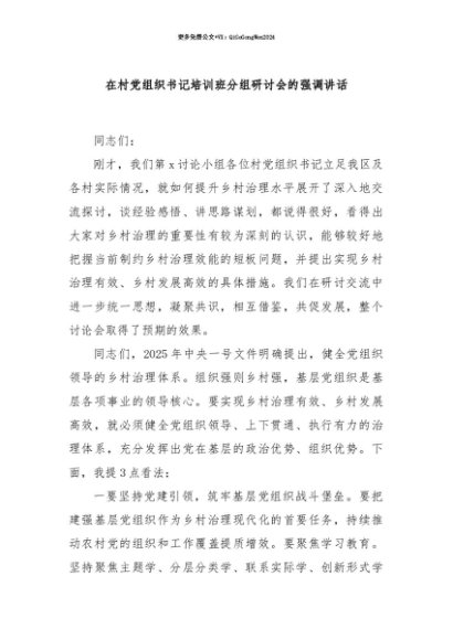 【七哥公文】2025年:【七哥公文】在村党组织书记培训班分组研讨会的强调讲话+更多免费公文+VX:QiGeGongWen2024+更多免费公文+VX:QiGeGongWen2024