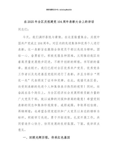 【七哥公文】2025年:【七哥公文】在2025年全区庆祝建党104周年表彰大会上的讲话+更多免费公文+VX:QiGeGongWen2024+更多免费公文+VX:QiGeGongWen2024