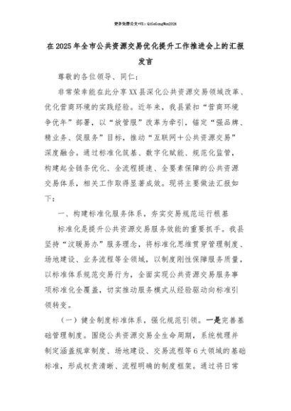 【七哥公文】2025年:【七哥公文】在2025年全市公共资源交易优化提升工作推进会上的汇报发言+更多免费公文+VX:QiGeGongWen2024+更多免费公文+VX:QiGeGongWen2024