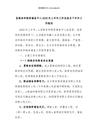 【七哥公文】2025年:【七哥公文】县粮食和物资储备中心2025年上半年工作总结及下半年工作规划+更多免费公文+VX:QiGeGongWen2024+更多免费公文+VX:QiGeGongWen2024