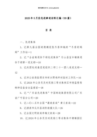 【七哥公文】2025年:【七哥公文】(99篇)2025年5月份先进事迹材料汇编+更多免费公文+VX:QiGeGongWen2024+更多免费公文+VX:QiGeGongWen2024