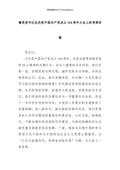 【七哥公文】2025年:【七哥公文】镇党委书记在庆祝中国共产党成立104周年大会上的党课讲稿+更多免费公文+VX:QiGeGongWen2024+更多免费公文+VX:QiGeGongWen2024