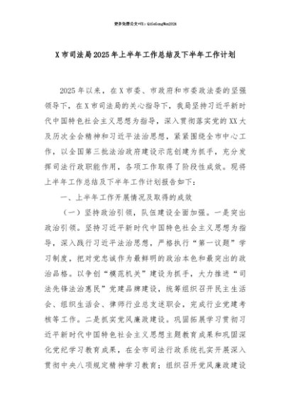 【七哥公文】2025年:【七哥公文】X市司法局2025年上半年工作总结及下半年工作计划+更多免费公文+VX:QiGeGongWen2024+更多免费公文+VX:QiGeGongWen2024