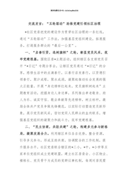 【七哥公文】2025年:【七哥公文】交流发言:“五轮驱动”助推党建引领社区治理+更多免费公文+VX:QiGeGongWen2024+更多免费公文+VX:QiGeGongWen2024