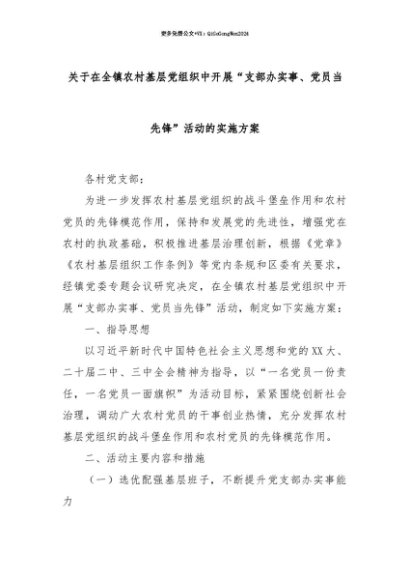 【七哥公文】2025年:【七哥公文】关于在全镇农村基层党组织中开展“支部办实事、党员当先锋”活动的实施方案+更多免费公文+VX:QiGeGongWen2024+更多免费公文+VX:QiGeGongWen2024