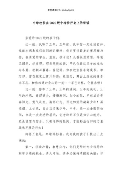 【七哥公文】2025年:【七哥公文】中学校长在2022级中考壮行会上的讲话+更多免费公文+VX:QiGeGongWen2024+更多免费公文+VX:QiGeGongWen2024