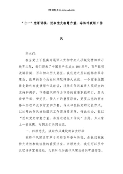 【七哥公文】2025年:【七哥公文】“七一”党课讲稿:汲取党史智慧力量,淬炼过硬组工作风+更多免费公文+VX:QiGeGongWen2024+更多免费公文+VX:QiGeGongWen2024