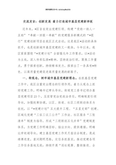【七哥公文】2025年:【七哥公文】交流发言:创新发展 着力打造城市基层党建新样板+更多免费公文+VX:QiGeGongWen2024+更多免费公文+VX:QiGeGongWen2024