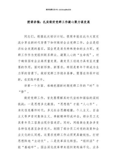 【七哥公文】2025年:【七哥公文】授课讲稿:扎实做好党群工作凝心聚力谋发展+更多免费公文+VX:QiGeGongWen2024+更多免费公文+VX:QiGeGongWen2024