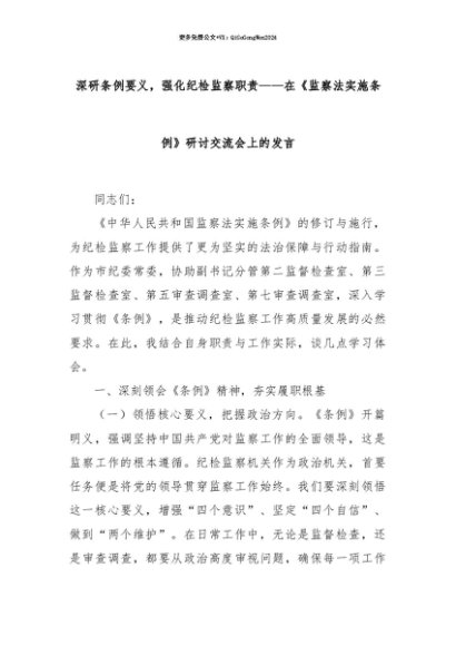 【七哥公文】2025年:【七哥公文】深研条例要义,强化纪检监察职责——在《监察法实施条例》研讨交流会上的发言+更多免费公文+VX:QiGeGongWen2024+更多免费公文+VX:QiGeGongWen2024