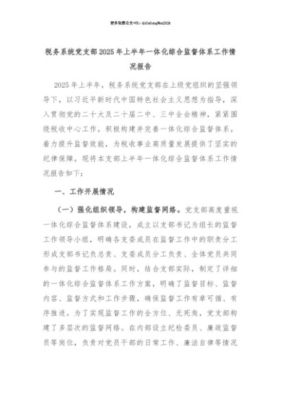 【七哥公文】2025年:【七哥公文】税务系统党支部2025年上半年一体化综合监督体系工作情况报告+更多免费公文+VX:QiGeGongWen2024+更多免费公文+VX:QiGeGongWen2024