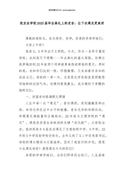 【七哥公文】2025年:【七哥公文】校友在学校2025届毕业典礼上的发言:让下次遇见更美好+更多免费公文+VX:QiGeGongWen2024+更多免费公文+VX:QiGeGongWen2024