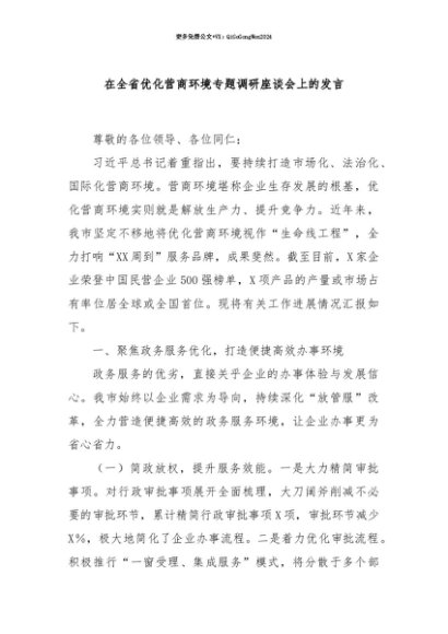 【七哥公文】2025年:【七哥公文】在全省优化营商环境专题调研座谈会上的发言+更多免费公文+VX:QiGeGongWen2024+更多免费公文+VX:QiGeGongWen2024