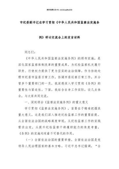 【七哥公文】2025年:【七哥公文】市纪委副书记在学习贯彻《中华人民共和国监察法实施条例》研讨交流会上的发言材料+更多免费公文+VX:QiGeGongWen2024+更多免费公文+VX:QiGeGongWen2024