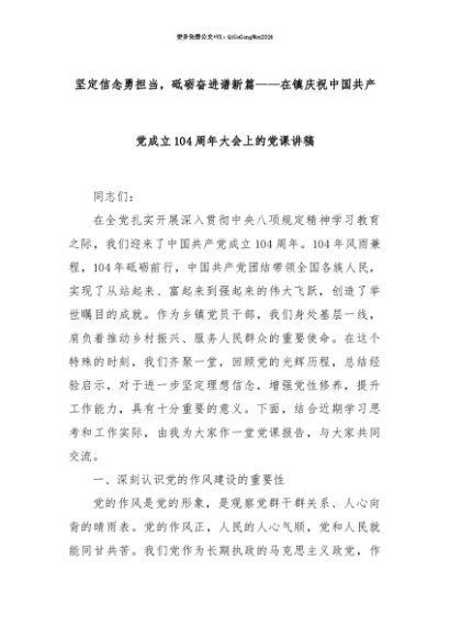 【七哥公文】2025年:【七哥公文】坚定信念勇担当,砥砺奋进谱新篇——在镇庆祝中国共产党成立104周年大会上的党课讲稿+更多免费公文+VX:QiGeGongWen2024+更多免费公文+VX:QiGeGongWen2024