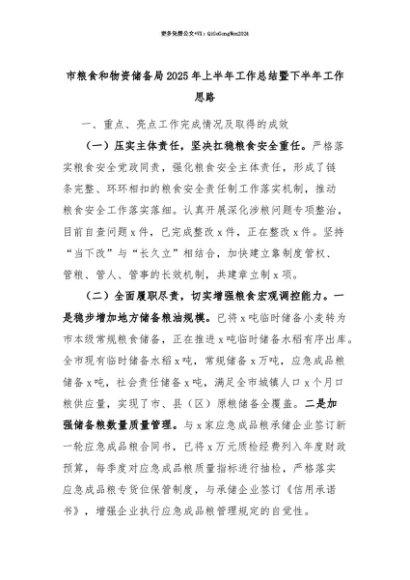 【七哥公文】2025年:【七哥公文】市粮食和物资储备局2025年上半年工作总结暨下半年工作思路+更多免费公文+VX:QiGeGongWen2024+更多免费公文+VX:QiGeGongWen2024