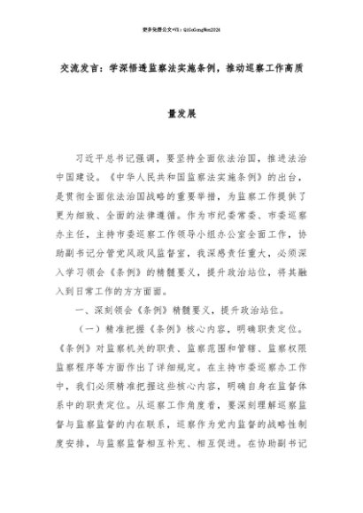 【七哥公文】2025年:【七哥公文】交流发言:学深悟透监察法实施条例,推动巡察工作高质量发展+更多免费公文+VX:QiGeGongWen2024+更多免费公文+VX:QiGeGongWen2024