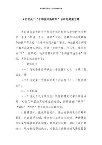【七哥公文】2025年:【七哥公文】X街道关于“干部作风焕新年”活动的实施方案+更多免费公文+VX:QiGeGongWen2024+更多免费公文+VX:QiGeGongWen2024