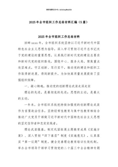 【七哥公文】2025年:【七哥公文】(5篇)2025年全市组织工作总结材料汇编+更多免费公文+VX:QiGeGongWen2024+更多免费公文+VX:QiGeGongWen2024