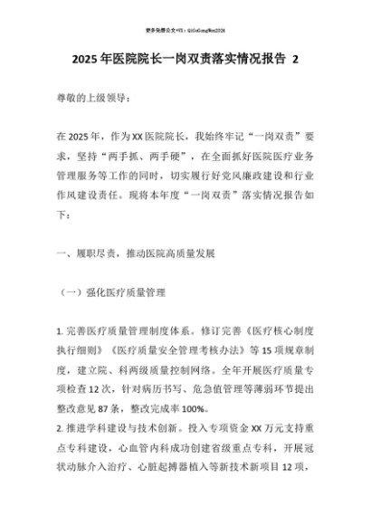 【七哥公文】2025年:【七哥公文】2025年医院院长一岗双责落实情况报告 2+更多免费公文+VX:QiGeGongWen2024+更多免费公文+VX:QiGeGongWen2024