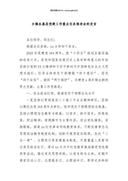 【七哥公文】2025年:【七哥公文】乡镇在基层党建工作重点任务推进会的发言+更多免费公文+VX:QiGeGongWen2024+更多免费公文+VX:QiGeGongWen2024