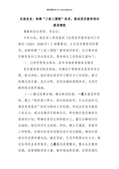 【七哥公文】2025年:【七哥公文】交流发言:构建“三抓三围绕”体系,推动党员教育培训提质增效+更多免费公文+VX:QiGeGongWen2024+更多免费公文+VX:QiGeGongWen2024