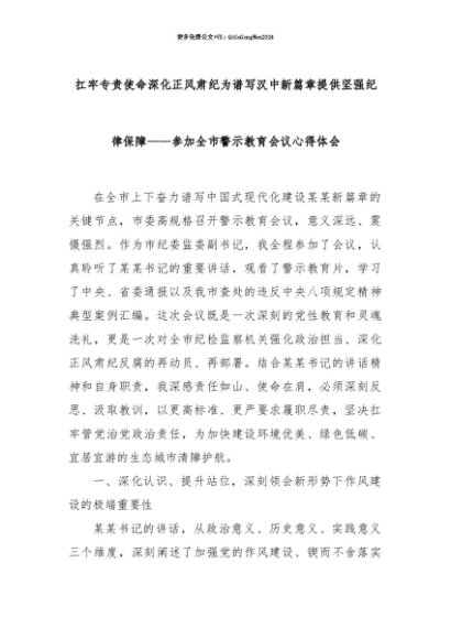 【七哥公文】2025年:【七哥公文】扛牢专责使命深化正风肃纪为谱写汉中新篇章提供坚强纪律保障——参加全市警示教育会议心得体会+更多免费公文+VX:QiGeGongWen2024+更多免费公文+VX:QiGeGongWen2024