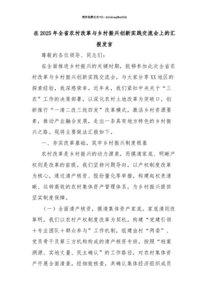 【七哥公文】2025年:【七哥公文】在2025年全省农村改革与乡村振兴创新实践交流会上的汇报发言+更多免费公文+VX:QiGeGongWen2024+更多免费公文+VX:QiGeGongWen2024