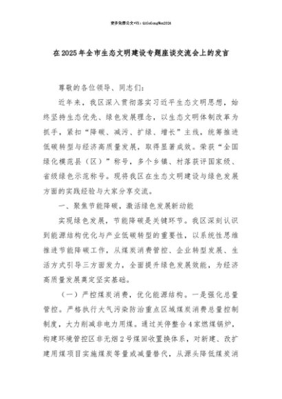 【七哥公文】2025年:【七哥公文】在2025年全市生态文明建设专题座谈交流会上的发言+更多免费公文+VX:QiGeGongWen2024+更多免费公文+VX:QiGeGongWen2024