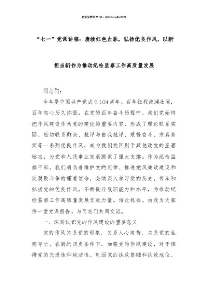 【七哥公文】2025年:【七哥公文】“七一”党课讲稿:赓续红色血脉,弘扬优良作风,以新担当新作为推动纪检监察工作高质量发展+更多免费公文+VX:QiGeGongWen2024+更多免费公文+VX:QiGeGongWen2024