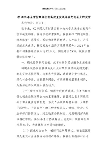 【七哥公文】2025年:【七哥公文】在2025年全省村集体经济高质量发展经验交流会上的发言+更多免费公文+VX:QiGeGongWen2024+更多免费公文+VX:QiGeGongWen2024