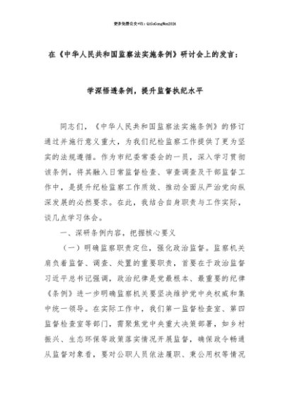 【七哥公文】2025年:【七哥公文】在《中华人民共和国监察法实施条例》研讨会上的发言:学深悟透条例,提升监督执纪水平+更多免费公文+VX:QiGeGongWen2024+更多免费公文+VX:QiGeGongWen2024