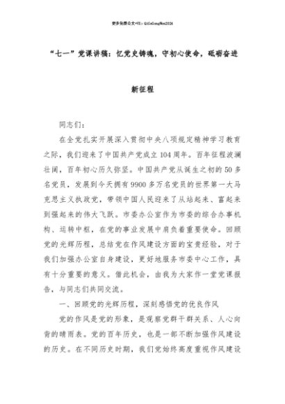 【七哥公文】2025年:【七哥公文】“七一”党课讲稿:忆党史铸魂,守初心使命,砥砺奋进新征程+更多免费公文+VX:QiGeGongWen2024+更多免费公文+VX:QiGeGongWen2024